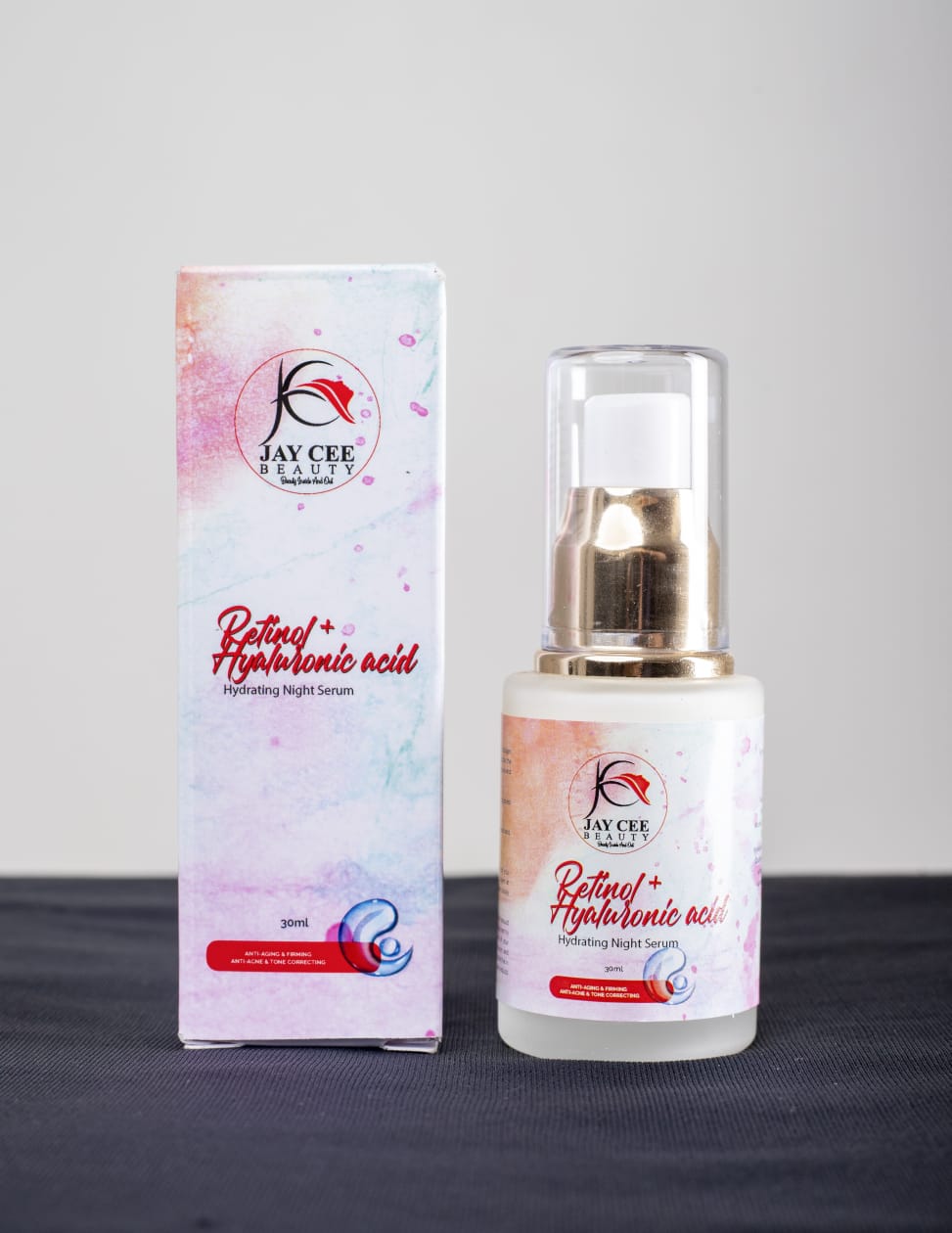 This Retinol + hyaluronic night hydrating serum improves collagen production, speeds up skin renewal, improves skin elasticity and reduces the appearance of fine lines, wrinkles, age spots, and uneven skin tone.